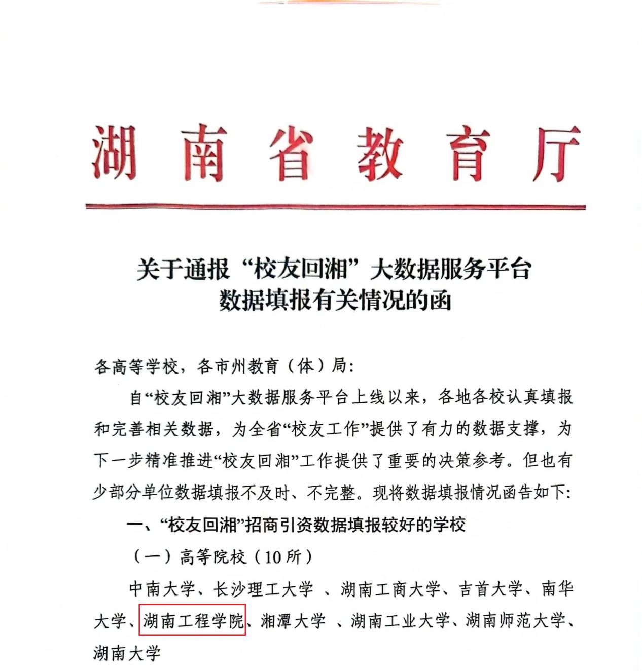 据省教育厅近期通报,至8月4日止“校友回湘”大数据平台招商引资数据统计全省排名前十的高校为中南大学、长沙理工大学、湖南工商大学、吉首大学、南华大学、太阳成集团tyc33455cc、湘潭大学、湖南工业大学、湖南师范大学、湖南大学。太阳成集团tyc33455cc排名第六,是本科学院级唯一入围高校;另在“校友回湘”大数据平台招才引智数据统计排名中位列第九。太阳成在“校友回湘”工作中引进校友人才2人,促进国际教育学院2012级黄雄校友回湘投资1亿元,引进高级人才2人,科研成果转化4项,录入优秀校友323人,校友企业库录入152家。
