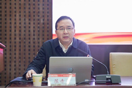 陈赤平从会议基本情况、会议主要精神、住湘全国政协委员履职情况、个人履职情况四个方面全面系统宣讲了2023年全国两会精神。他重点围绕习近平总书记在全国两会上的重要讲话精神,选举产生新一届国家机构和全国政协领导人员,政府工作报告、全国人民代表大会常务委员会工作报告等重要内容进行深入阐释,并重点传达了习近平总书记在参加十四届全国人大一次会议江苏代表团审议时的重要讲话精神、在看望参加全国政协十四届一次会议的民建工商联界委员时的重要讲话精神、在出席十四届全国人大一次会议解放军和武警部队代表团全体会议上的重要讲话精神。