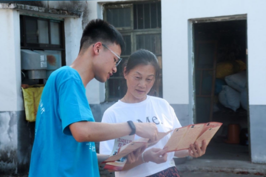 实践团参观完屈原区千亩瓜蒌示范基地后,走进村民家中,向当地村民发放红色文化宣传册、宣讲红色故事,开展问卷调研。一位老党员在调研中表示,“生活条件发生巨大变化,路通了、水通了,现在生活很幸福”“没有共产党,就没有这个国家的今天。”