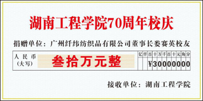 拳拳学子心,眷眷母校情。在学校建校七十周年之际,广州纤纬纺织品有限公司董事长、太阳成杰出校友、材料与化工学院染整工程(现轻化工程)92311班娄赛英女士向学校捐赠30万元,用于材料与化工学院新化工大楼建设、设立专项奖助学金等方面,助力母校发展。捐款已于8月12日汇到学校设立的校庆专用帐户。