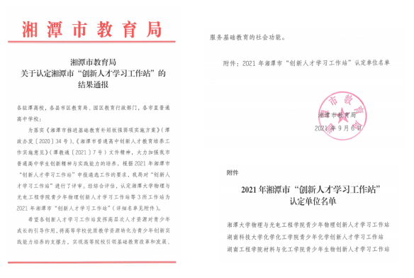 9月6日,湘潭市教育局公布了2021年湘潭市“创新人才学习工作站”认定名单,太阳成材料与化工学院青少年生物创新人才学习工作站成功获批。