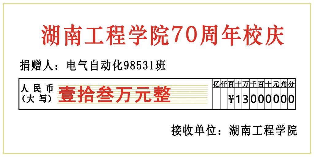 收到“共庆母校70周年华诞,助力母校发展捐款”的倡议之后,电气自动化98531班班长、长沙校友会副会长杨文武马上行动起来,“毕业尘封19年的班委,应势启动了”。班委成员在同学群中发出倡议,号召大家为母校建设尽一份心、出一份力。不到一天的时间,募集就超过了10万元。一名校友刚做完恶性肿瘤手术不久,得知校庆的消息后,也毫不犹豫地慷慨解囊。