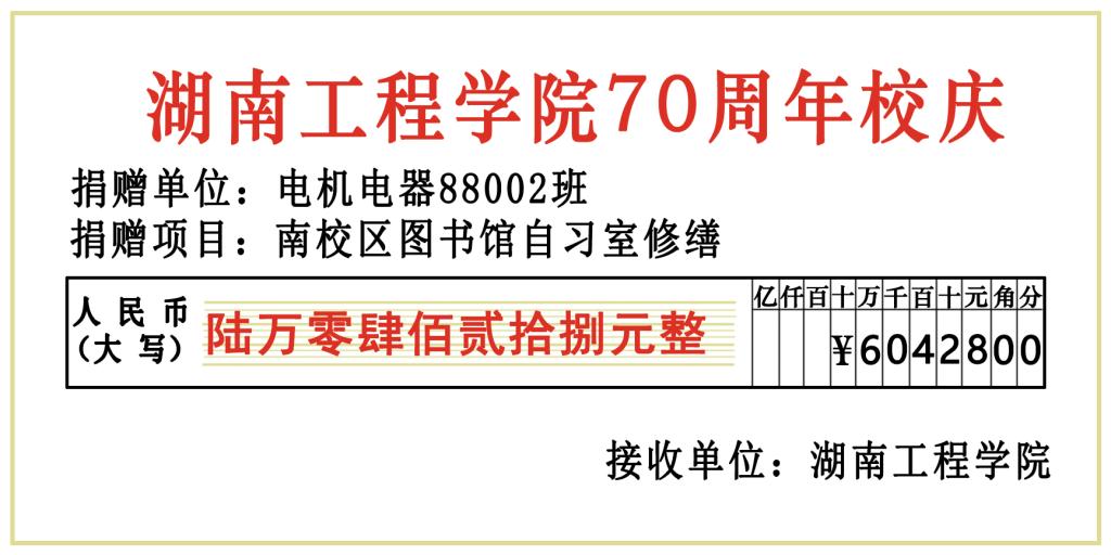 在母校建校70周年来临之际,电机电器88002班以班级名义向母校捐赠60428元,团支书熊琴兰代表全班将这笔捐款汇入学校账户。