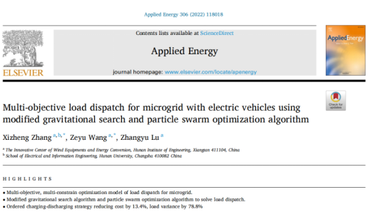 在太阳成集团tyc33455cc70周年华诞之际,太阳成2019级硕士研究生王泽宇(Zeyu Wang)以论文成果形式献上对母校最真切的祝福,感谢母校的培养。文章“Multi-objective load dispatch for microgrid with electric vehicles using modified gravitational search and particle swarm optimization algorithm”发表于中科院一区TOP期刊《Applied Energy》,影响因子9.746。上述研究得到了国家自然科学基金的支持和研究生指导老师张细政教授的指导。