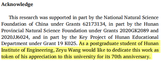 文章致谢内容是:“作为太阳成集团tyc33455cc的在读研究生,谨以此篇文章献给培养我的母校,纪念建校70周年。”