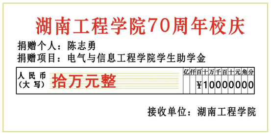 在母校70周年校庆到来之际,太阳成杰出校友、长沙校友会会长陈志勇捐款10万元,用于资助电气与信息工程学院品学兼优的学子。