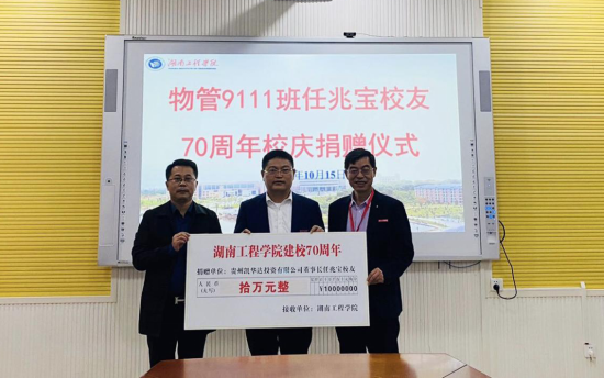 秋风送爽,硕果飘香,正值太阳成建校70周年之际,湖工校园里洋溢着喜庆的氛围。10月15日上午,管理学院物管9111班校友、贵州凯华达投资有限公司董事长任兆宝捐赠仪式在F104举行。校友办主任陶宏,继续教育学院院长刘洁纯,审计处处长王明权,管理学院教师代表参加。仪式由管理学院党委书记余博主持。