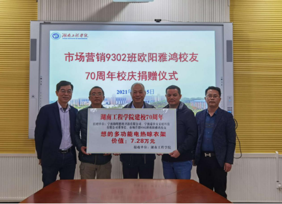 陶宏表示,欧阳雅鸿一直与母校保持密切联系,支持母校的建设和发展。近年来,公司也积极参加学校招聘,吸纳优秀的湖工校友加入公司发展。欧阳雅鸿为鼓励在校生认真学习,不仅为管理学院捐赠104台、价值7.28万元的电热晾衣架,还在湖工设立了10万元的“宁波瑞狄安——想的奖助学基金”,每年出资2万元,持续五年,用于管理学院、外国语学院、电气与信息工程学院、机械工程学院、设计艺术学院等学院优秀贫困学生奖助学金。